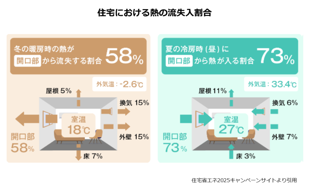 特に窓等の開口部における熱の流入失は住宅全体の約6~7割に及び、開口部が建物全体の断熱性能に大きな影響を与えております。